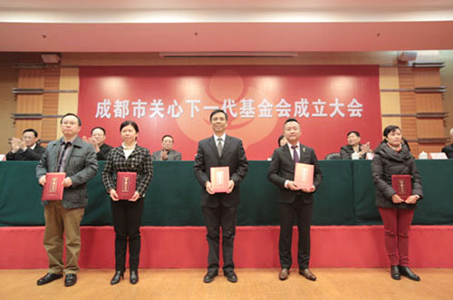 2014年12月22日,成都市关心下一代基金会在成都市总工会大厦2楼会议室隆重举行成立大会和揭牌仪式。省政协原副主席、省关心下一代基金会理事长陈 官权,省关心下一代基金会秘书长杜江,省民政厅副厅长陈克福等单位的领导到会祝贺。市人大常务委员会原主任、市关工委执行主任王东洲,成都市副市长田蓉, 市级有关部门和区(市)县关工委的负责同志,基金会现任13名理事、5名监事以及对基金会成立作出积极贡献的爱心企业负责人参加了成立大会,雷迪波尔服饰 股份有限公司董事长、成都市青年企业家商会会长刘长明应邀出席会议。