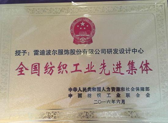 6月28日上午,在北京人民大会堂举行的全国纺织工业先进集体、劳动模范和先进工作者表彰大会上,雷迪波尔服饰股份有限公司研发设计中心获评为全国纺织工业先进集体。来自全国纺织工业劳动模范和先进工作者、全国纺织工业先进集体的代表449人欢聚一堂,接受党和人民授予的崇高荣誉。第十届全国人大常委会副委员长顾秀莲,工业和信息化部副部长冯飞,国家公务员局党组成员、副局长吴云华,人力资源社会保障部国家表彰奖励办公室主任、国家公务员局考核奖励司司长薛红,发展改革委产业协调司副司长卢卫生,工业和信息化部消费品工业司副司长曹学军,国资委行业协会联系办公室副主任张涛,中国财贸轻纺烟草工会副主席杨冬旭,中国纺织工业联合会会长王天凯,中国纺织工业联合会原会长杜钰洲,中国纺织工业联会会副会长高勇、孙瑞哲、徐文英、杨纪朝、夏令敏,党委副书记陈伟康,顾问杨东辉、张延恺、张莉、中国机械工业联合会、中国金融政研会等行业协会领导出席了表彰大会。雷迪波尔服饰股份有限公司副总裁、董事会秘书宋羲参加会议并领奖。
