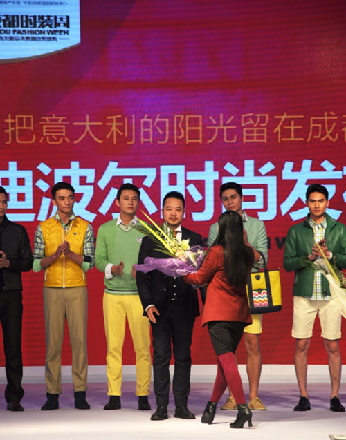 图:雷迪波尔服饰股份有限公司副总裁卢山在2013成都时装周开幕秀上谢幕