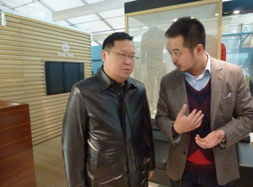 图:雷迪波尔企业副总裁卢山向中国服装协会副秘书长谢青介绍雷迪波尔参展情况