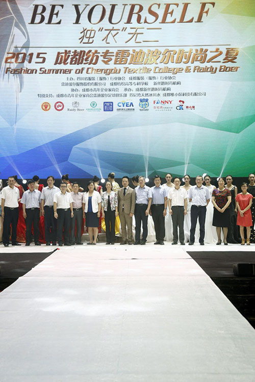 6月25日下午,“Be yourself”——独“衣”无二 2015成都纺专雷迪波尔时尚之夏优秀毕业生作品展在成都世外桃源大剧院举行。成都纺织高等专科学校党委书记尹析明,中国纺织工业联合会副会长杨纪朝,中国纺织工业企业家协会副会长王进军,雷迪波尔服饰股份有限公司副总裁、成都意华堂贸易有限公司总经理、雷迪波尔服装学院院长卢山共同出席活动。