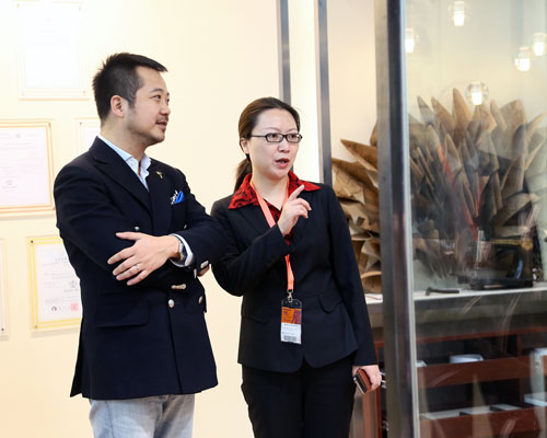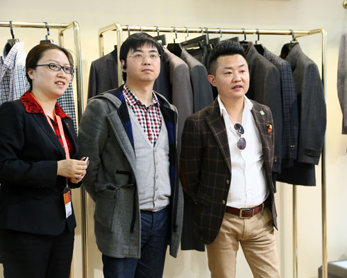 图:雷迪波尔服饰股份有限公司副总裁卢山(左)与定制事业部总经理王永萍讨论男装高级定制发展方向